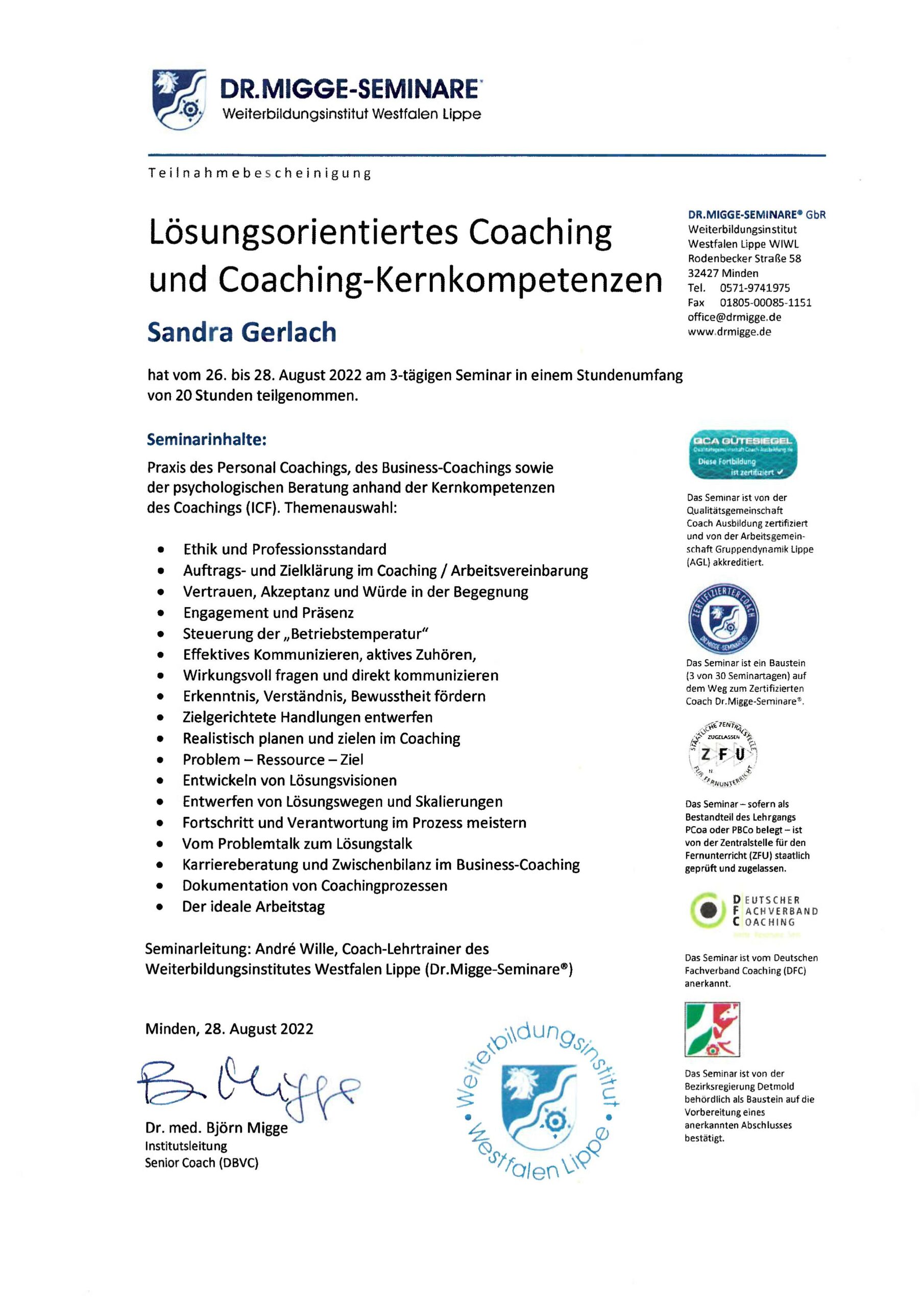 Mir ist wichtig, dass Coaching nicht nur inspirierend, sondern auch fundiert und professionell ist. Deshalb habe ich umfassende theoretische und praktische Kenntnisse in methodenübergreifender psychologischer Beratung und Personal Coaching erworben.